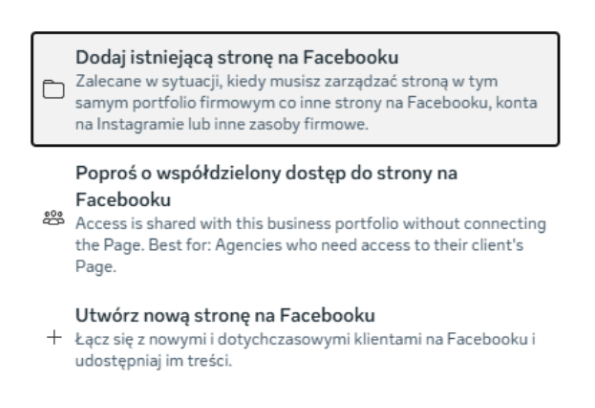 Zakładając portfolio firmowe firmy Meta, możecie od razu stworzyć nową stronę firmową od zera lub dodać już istniejącą. W zależności od danej opcji, może to wyglądać w ten sposób: