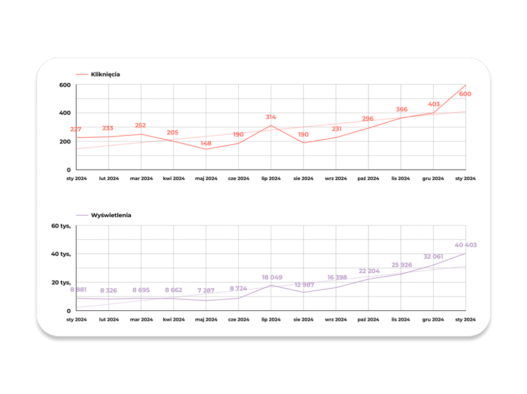 Prawie 3-krotny wzrost liczby kliknięć oraz prawie 5-krotny wzrost wyświetleń strony internetowej w ciągu 10 miesięcy od rozpoczęcia współpracy.